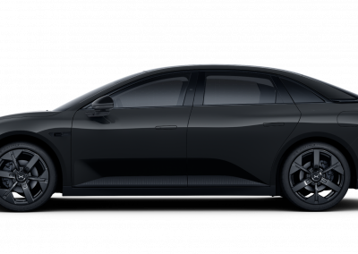 Seitenansicht des schwarzen XPENG Mona M03 mit klarer Coupé-Linie. Die bündigen Türgriffe und rahmenlosen Spiegel unterstreichen den futuristischen Stil und den Luftwiderstandsbeiwert von nur 0,194.