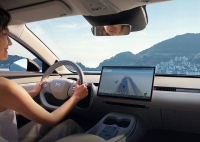 Fahrerin im hellen Innenraum des XPENG Mona M03. Das zentrale Touch-Display zeigt den Fahrassistenten,