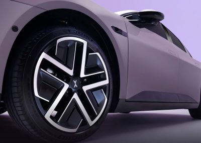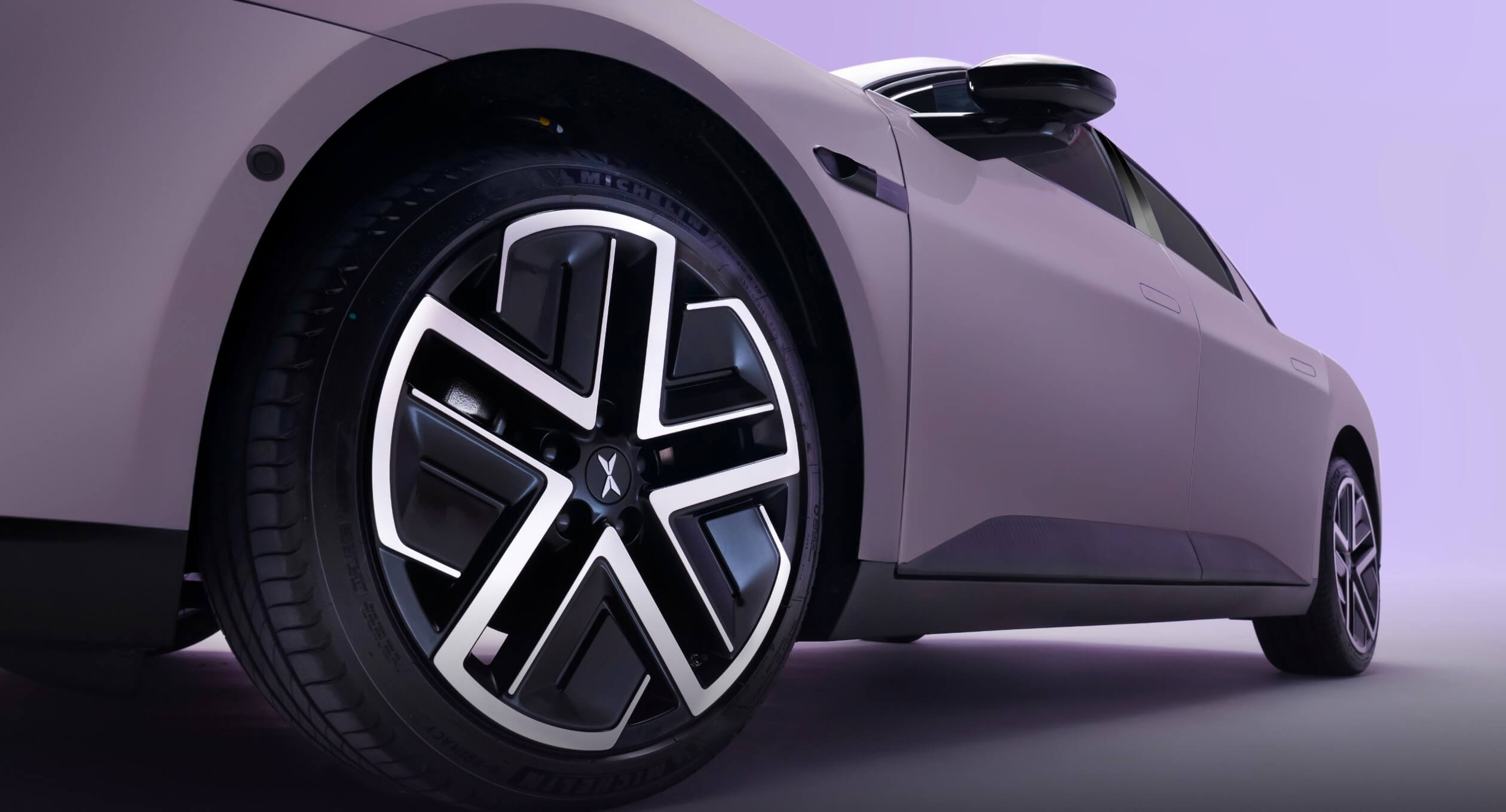 Detailaufnahme der aerodynamischen XPENG-Felgen mit kontrastreicher X-Form. Die 19-Zoll-Räder unterstreichen Effizienz und sportliche Eleganz des Mona M03.