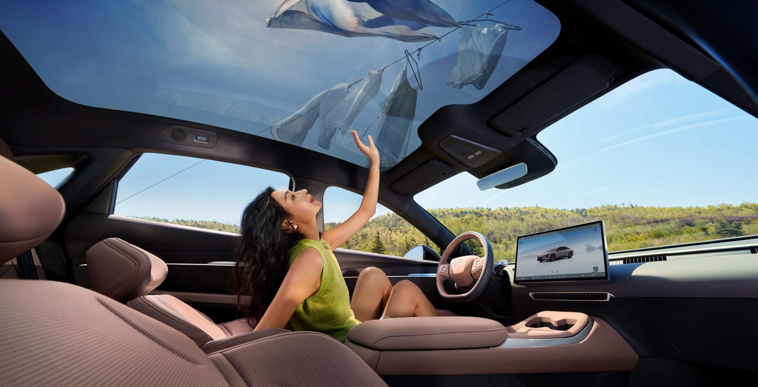 Innenraumansicht des XPENG Mona M03 mit großem Panoramadach. Eine Frau blickt nach oben, das Licht flutet den luxuriösen Fond